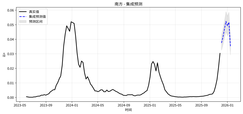 南方地区ILI+多模型综合预测结果,ILI+为ILI%和流感阳性率的一个综合指标