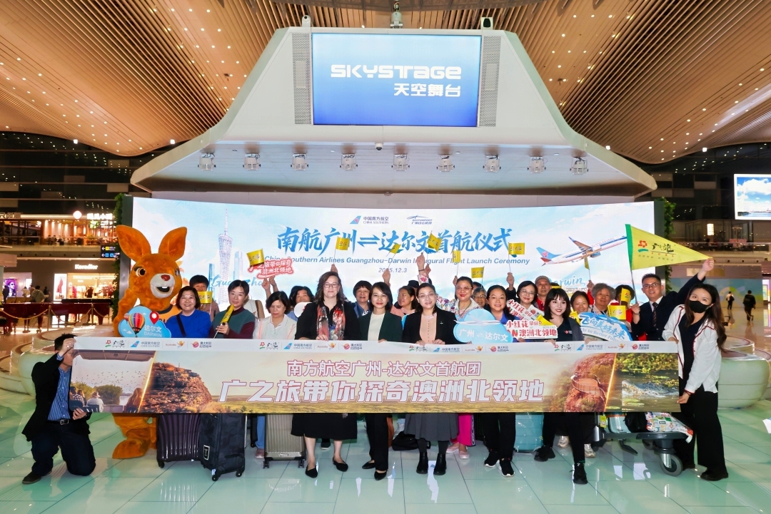 12月3日,中国南方航空正式开通广州至澳大利亚北领地首府达尔文的直飞航线,岭南集团旗下广之旅组织的首航团同步启程,开启为期6天的北领地探索之旅。南航、澳大利亚旅游局、北领地旅游局及广之旅相关负责人出席首航仪式,为游客送上纪念礼品。