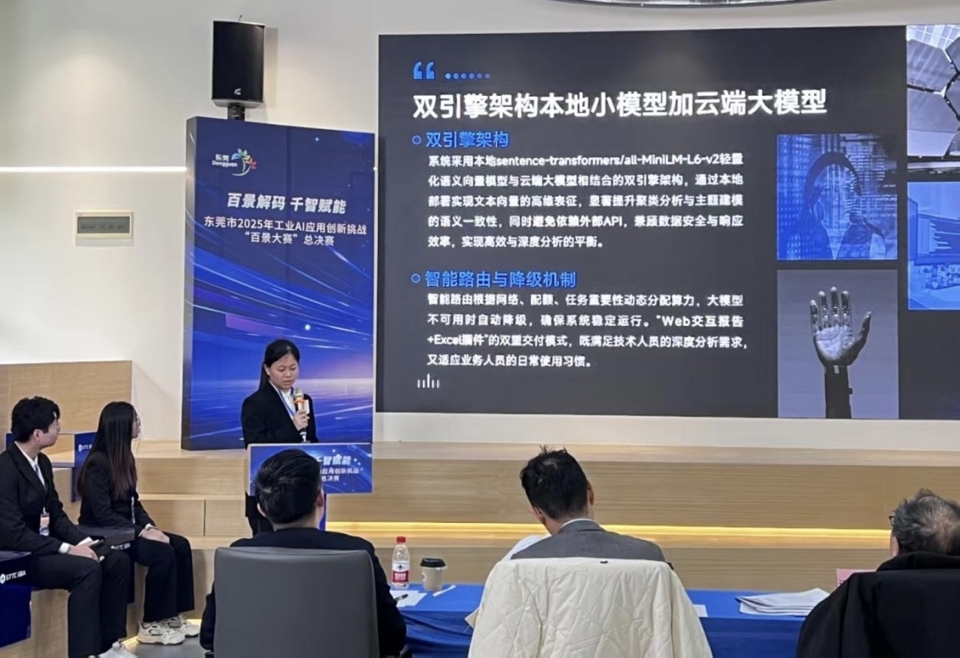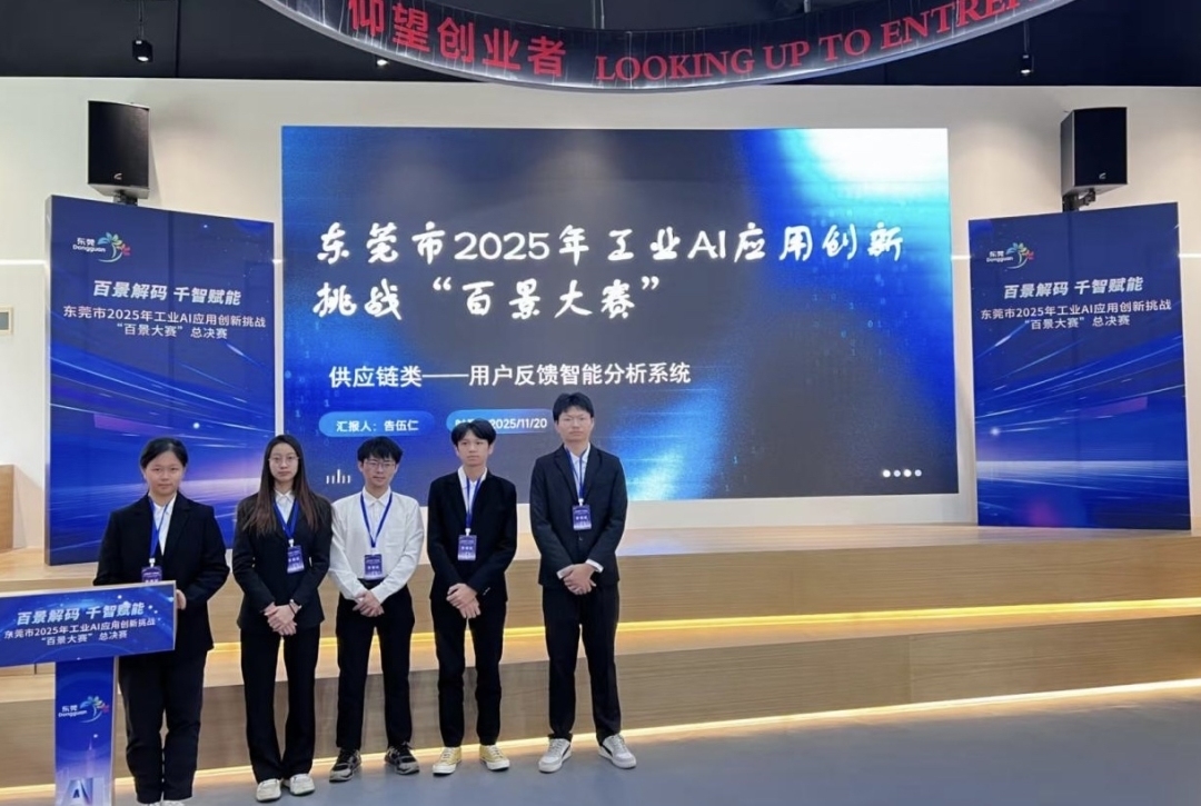 近日,东莞市2025年工业AI应用创新挑战“百景大赛”总决赛在滨海湾新区收官。东莞城市学院五位学生组成的战队,历经3小时的闭门路演评审,最终荣获决赛二等奖,获奖作品为《供应链类——用户反馈智能分析系统》。