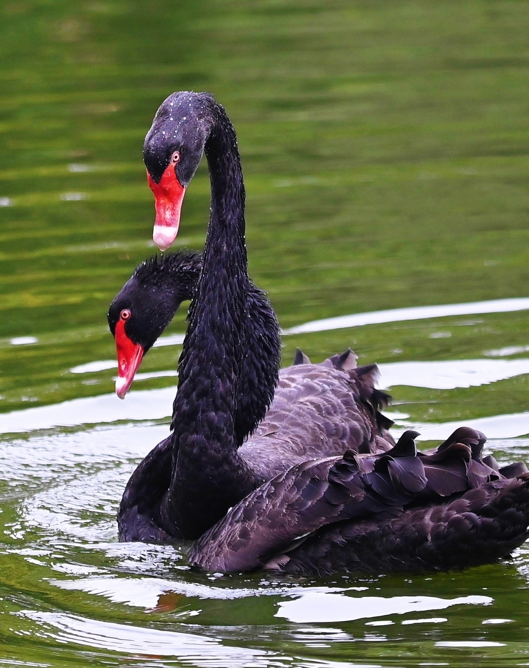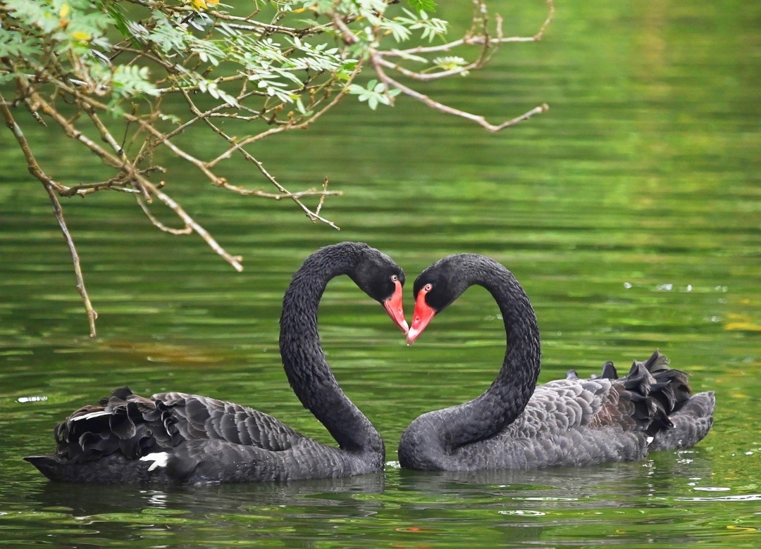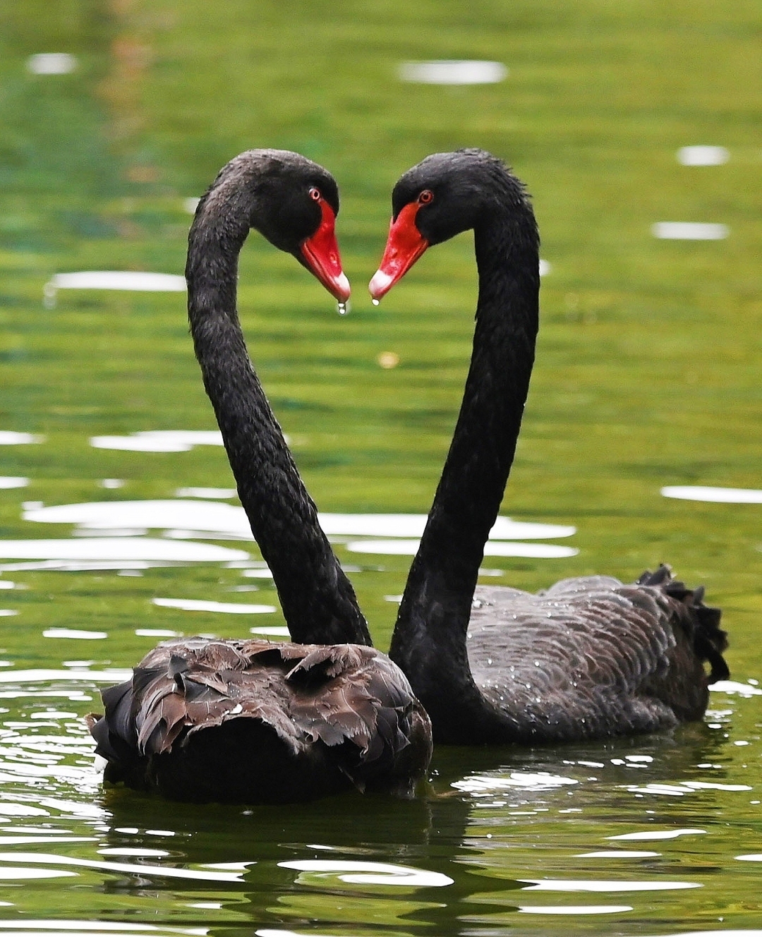 饲养员介绍,黑天鹅的求偶行为非常丰富,双方在湖水中相互配合把头潜入水中,随后又伸出水面,反复交颈摩挲,以喙相碰,常常形成各种优美的形状,“甜蜜”一番后,双方昂首相应鸣叫,仿佛对唱“情歌”。