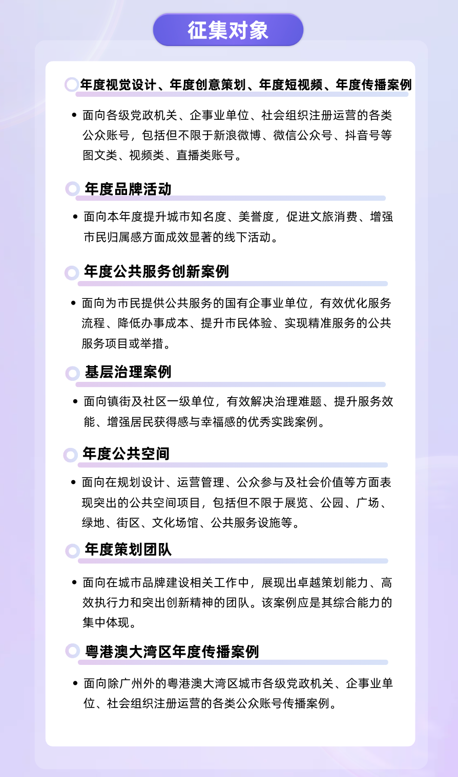 为全面展示2025年度城市品牌建设成果,提升城市知名度、美誉度和影响力,广州日报现向各单位征集与城市品牌塑造和传播相关的政务新媒体案例、线下品牌活动案例、公共空间设计与建设案例,以评促建,助力城市品牌建设迈上新台阶。