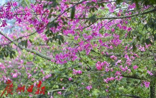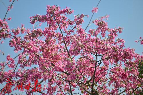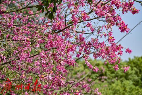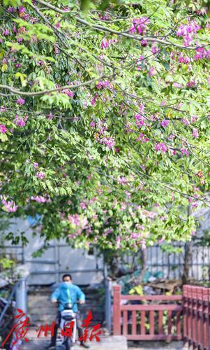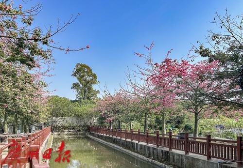 番禺区一条河涌边,一排美丽异木棉玫红花朵仍缀满枝头,与河涌碧水相映成趣。