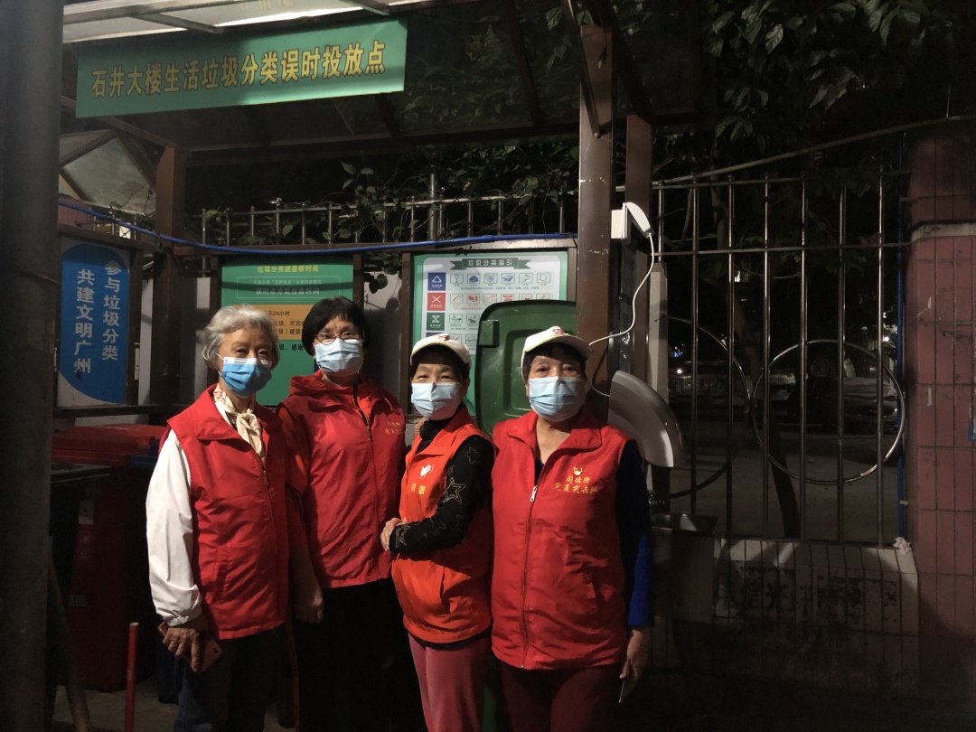 谢玉珊(左一)和其他志愿者一起,为社区的垃圾分类工作出力。