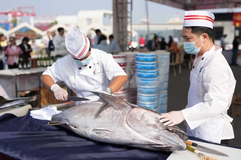 除了顶流车厘子,现场的鲜活市集同样人气爆棚。应季水果琳琅满目,牛排、深海鱼获、特色饮品与农特产品同步展销,一站式满足市民采购与尝鲜需求。活动现场火爆,游客络绎不绝:有的市民驻足车厘子摊档,仔细挑选心仪规格;有的游客围拢金枪鱼档口,90斤新鲜海钓金枪鱼现宰现卖,大家争相抢购;有的全家老少围逛市集,满载地道风物;还有的游客打卡拍照,记录这份冬日甜蜜,热闹的消费场景让冬日市集充满烟火气。