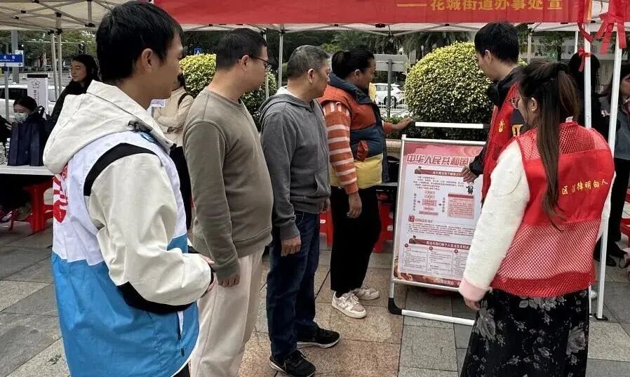 在普法摊位区,花城司法所联合街道多部门共同设立普法咨询专区,为群众提供“一站式”法律服务。现场通过发放宪法、民法典、农村集体经济组织法及法律援助指南等宣传资料,配合普法志愿者讲解与驻社区律师专业咨询,切实回应群众法律需求。