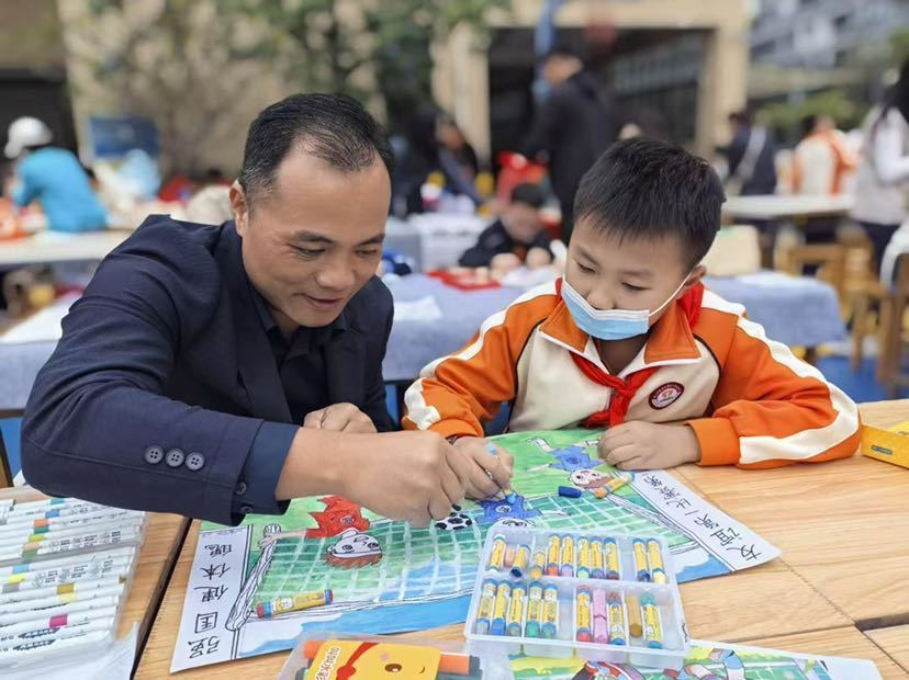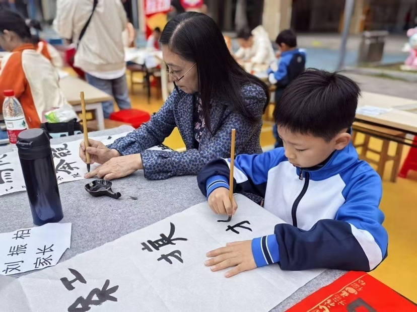与此同时,架空层的一角被同学们的剪纸、书画、彩灯作品装饰得琳琅满目,吸引了不少师生驻足欣赏。篮球场一侧的亲子书画体验活动也热闹非凡。在美术科教师的现场指导下,家长与孩子们携手创作,或挥毫泼墨、或精心勾勒,一幅幅充满创意与温情的作品在笔下诞生。