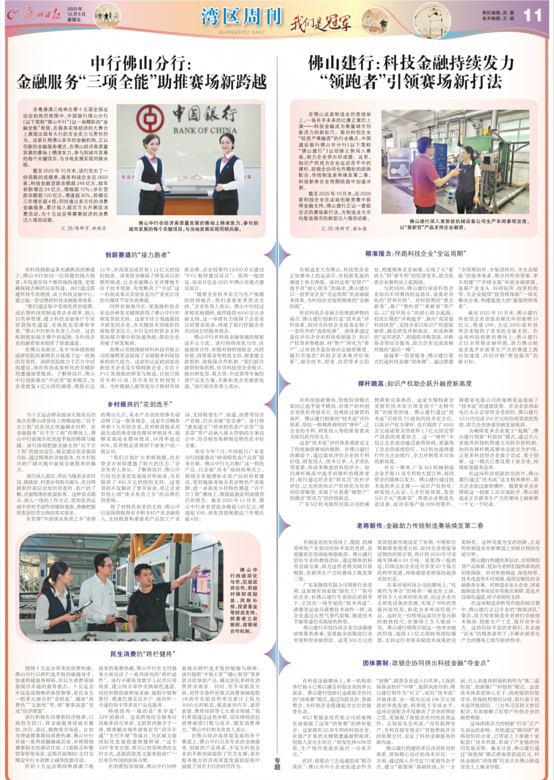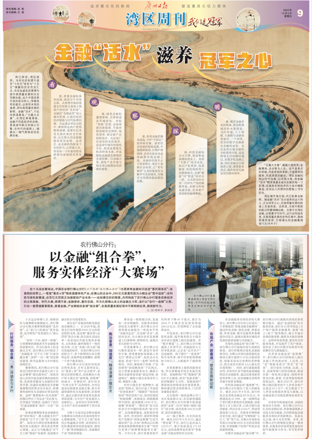珠江奔流,湾区澎湃。当时光的刻度行进至“十四五”收官与“十五五”谋篇的历史性交汇点,当全运盛会的激情与城市高质量发展的壮志同频共振,这片中国改革开放的前沿热土,带着冠军的姿态,以前所未有的速度,奔向高质量发展的新程。金融“活水”,于此间奔涌激荡;“五篇大文章”,在湾区挥毫落纸。金融不仅是经济的血脉,更是城市跃迁的核心引擎,在时代的版图上,铺展出一幅气势恢宏的发展长卷。