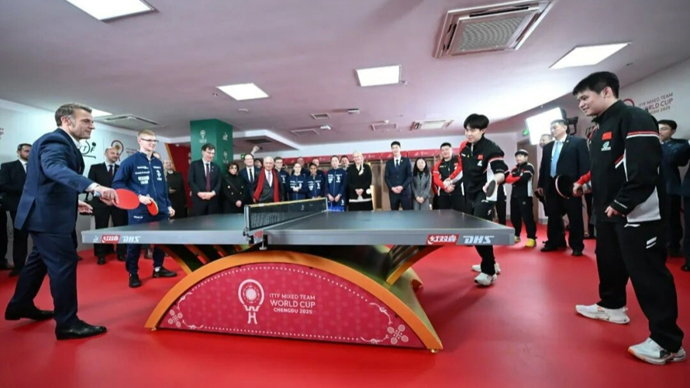 访问成都期间,马克龙还来到四川省体育馆看望参加混团世界杯比赛的法国乒乓球运动员,并与他们一起同中国乒乓球运动员王楚钦、孙颖莎、林诗栋等挥拍较量,与中国乒协主席王励勤进行互动。