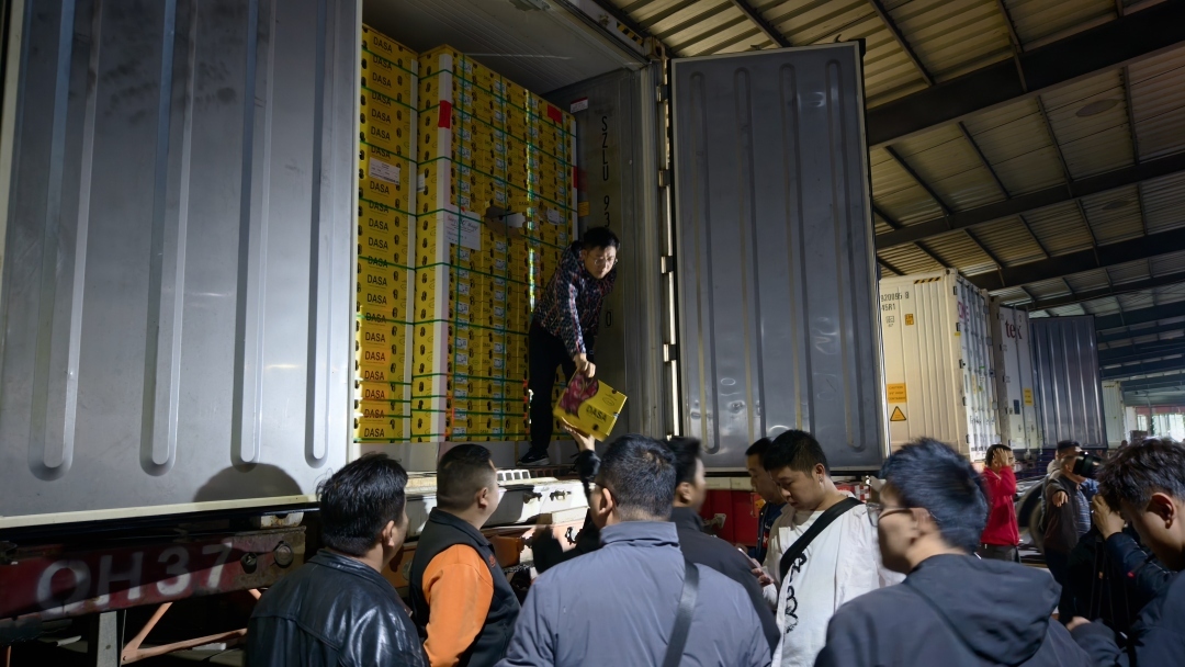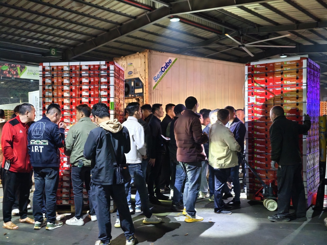 从凌晨近2时开始,车厘子冷链柜陆陆续续从南沙港码头出发,大约两个小时即可到达江南水果市场。随着一箱箱鲜红欲滴的车厘子迅速被从冷柜搬下送入批发区,市场的热闹氛围瞬间被点燃。各个档口前早已人头攒动,等候多时的采购商、批发商和市民蜂拥而上,这场跨越重洋的“甜蜜奔赴”,最终化作市民餐桌上满满的幸福感。