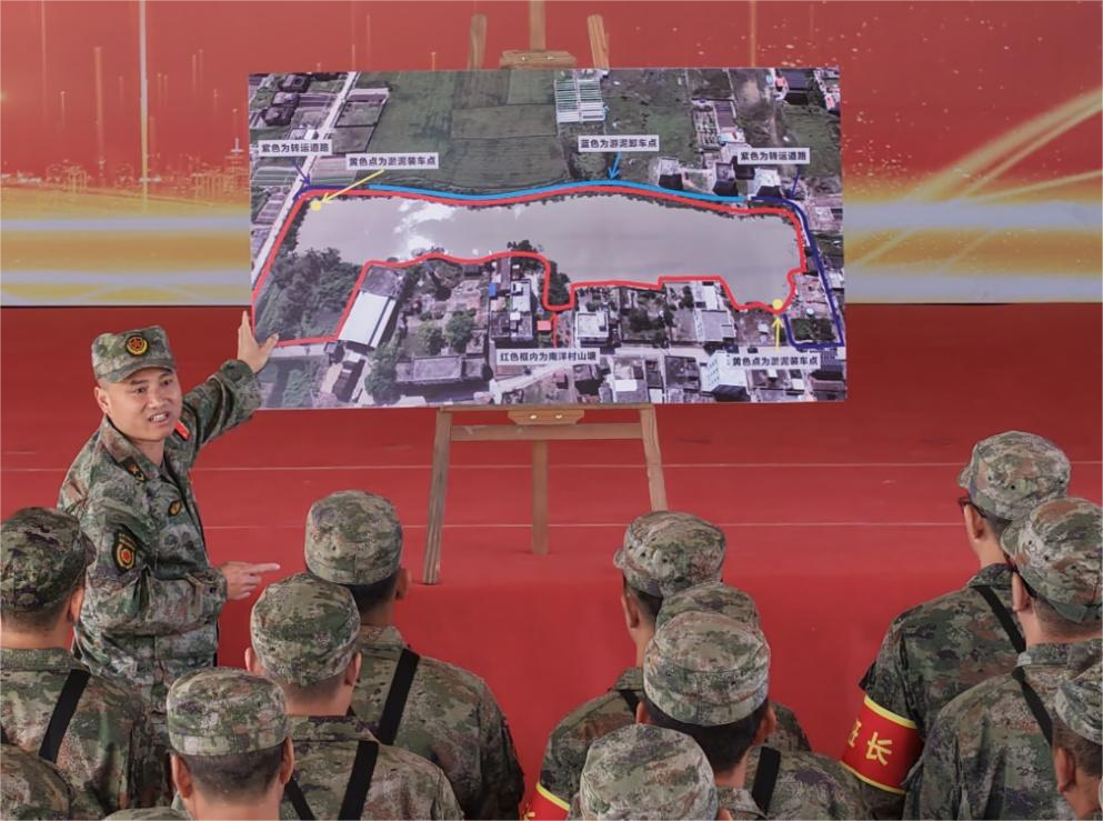 在已抽干积水的山塘现场,白云区人武部周密制定清淤方案,采取“机械为主、人工辅助、分区作业”的科学战法。伴随着挖掘机的轰鸣掘进,民兵队员们紧随其后进行精细清理。