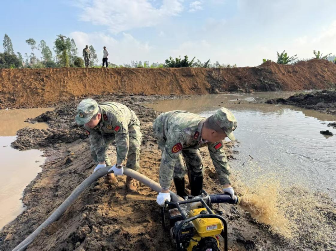 面对粤西战略民生项目,民兵队员们抵达后,立即全力投入山塘清淤等关键任务,以攻坚实际行动助力“百县千镇万村高质量发展工程”。任务伊始,面临时间紧、持续降雨、作业面泥泞湿滑等多重挑战,民兵队伍依托常态化练兵铸就的过硬本领和顽强作风,迅速展开作业。