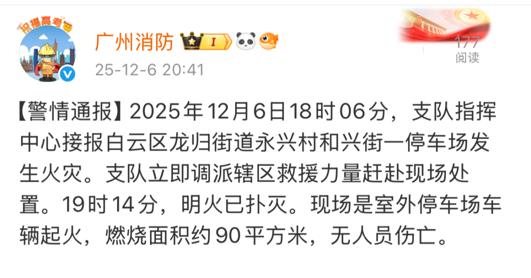 据广州市消防救援支队通报,2025年12月6日18时06分,支队指挥中心接报白云区龙归街道永兴村和兴街一停车场发生火灾。支队立即调派辖区救援力量赶赴现场处置。19时14分,明火已扑灭。现场是室外停车场车辆起火,燃烧面积约90平方米,无人员伤亡。