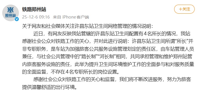 近日,有网友反映该站管辖的许昌东站卫生间配置有4名所长的情况,感谢社会公众对铁路工作的关心,并对此进行说明:许昌东站卫生间所谓“所长”并非专职职务,是车站为加强旅客公共服务设施管理划定的责任区,由车站管理人员兼任,与社会公共管理中的“路长制”“河长制”相同,共同承担管理和维护郑州站管内旅客服务设施的责任,此举为提升卫生间环境维护工作的全面参与和对服务质量的全面监督,不存在4名专职所长的岗位设置。