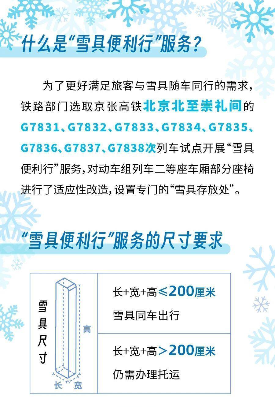 为了更好满足旅客与雪具随车同行的需求,铁路部门统筹考虑旅客安全、乘车秩序和雪具运输需求,选取京张高铁北京北至崇礼间的G7831、G7832、G7833、G7834、G7835、G7836、G7837、G7838次列车试点开展“雪具便利行”服务,对动车组列车二等座车厢部分座椅进行了适应性改造,设置专门的“雪具存放处”,旅客选择该服务后可携带长、宽、高之和不超过200厘米的雪具同车出行,滑雪更加方便快捷。对于长、宽、高之和超过200厘米的雪具,由于高铁列车车内空间限制,仍需办理托运。