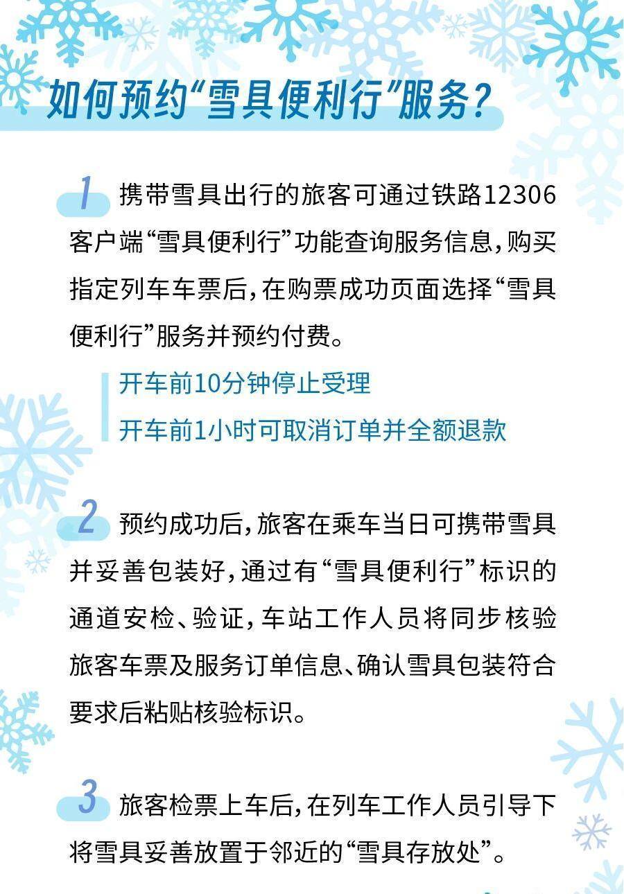 携带雪具出行的旅客可通过铁路12306客户端“雪具便利行”功能查询服务信息,购买指定列车车票后,在购票成功页面选择“雪具便利行”服务并预约付费,开车前10分钟停止受理,开车前1小时可取消订单并全额退款。