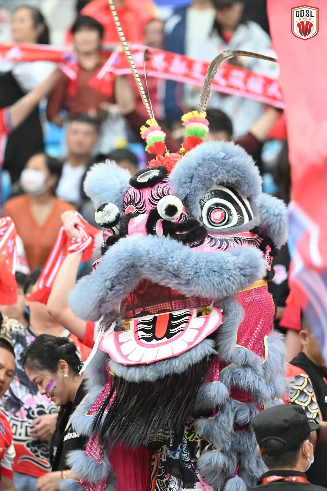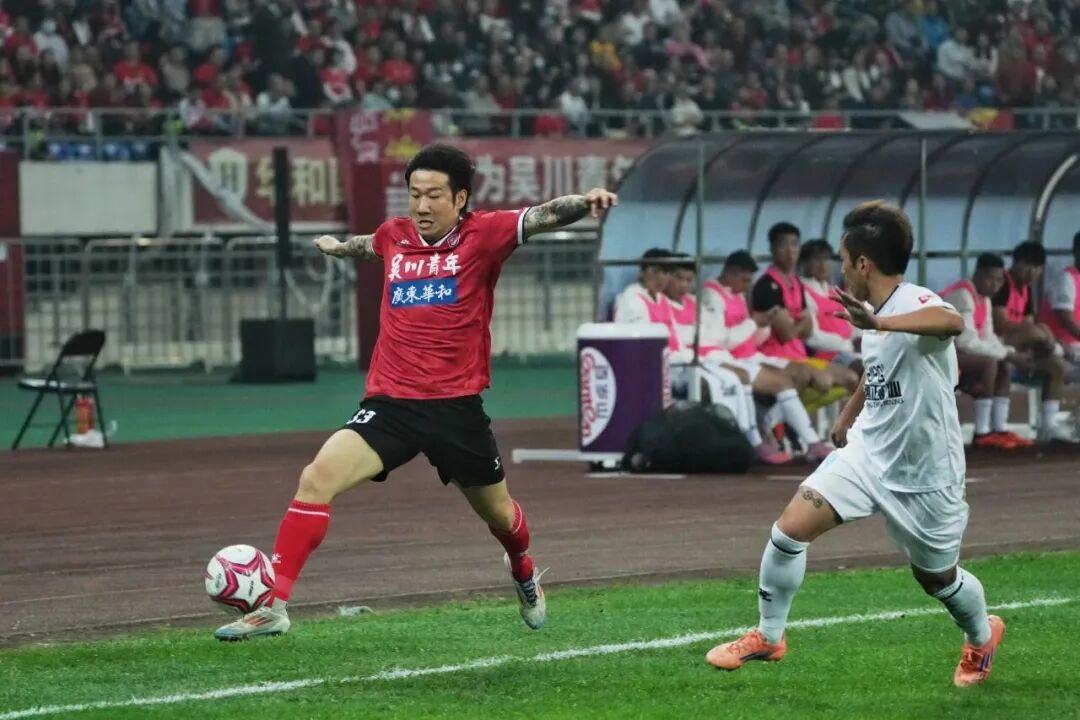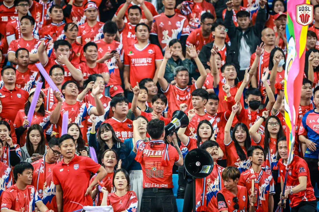比赛日当天,湛江体育中心内外人声鼎沸,球迷们早早聚集,敲锣打鼓、高举标语,吴川球迷团体的红色大旗在看台上格外醒目。赛场外,飘色巡游、舞貔貅等"吴川三绝"非遗表演轮番上演,将千年古城的人文底蕴与足球激情完美交融;吴川本土歌手大笨、蔡冬妮的现场献唱,更传递出"足球之乡"独有的温度与热忱。近4万名球迷挥舞巨幅队旗与手幅齐声高歌,助威声浪此起彼伏,营造出震撼人心的主场氛围。