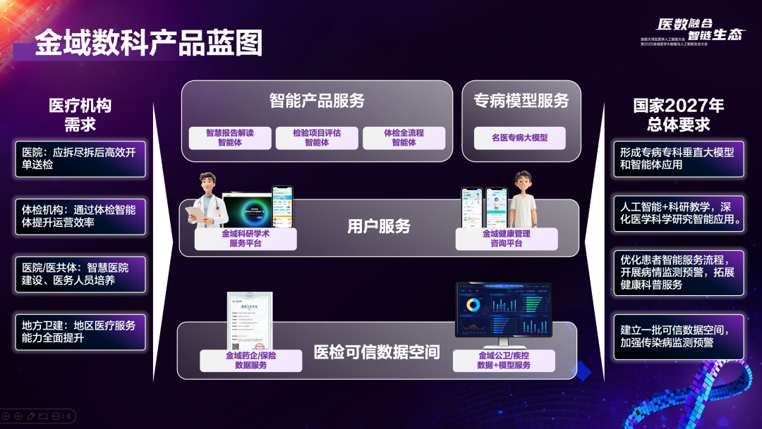 在本次生态大会上,金域医学全面展示医检数据科学与人工智能探索的成果。公司已构建起涵盖智能产品服务、专病模型服务、用户健康服务及医检可信数据空间四大核心板块的产品蓝图,新一批医检AI产品,如检验项目评估智能体、体检中心总体解决方案、科研学术服务平台以及名医专病大模型等在会上逐一亮相。