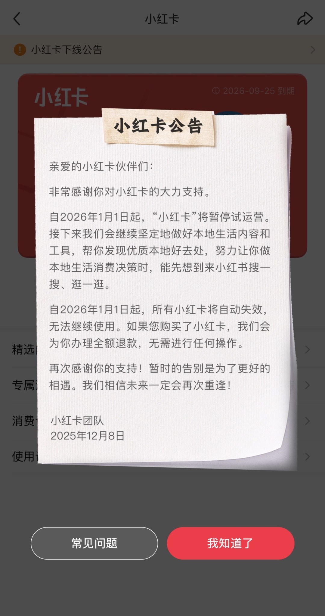 公告显示,2026年1月1日小红卡暂停运营后,小红书将会为购卡用户办理全额退款,购卡用户无需进行任何操作。