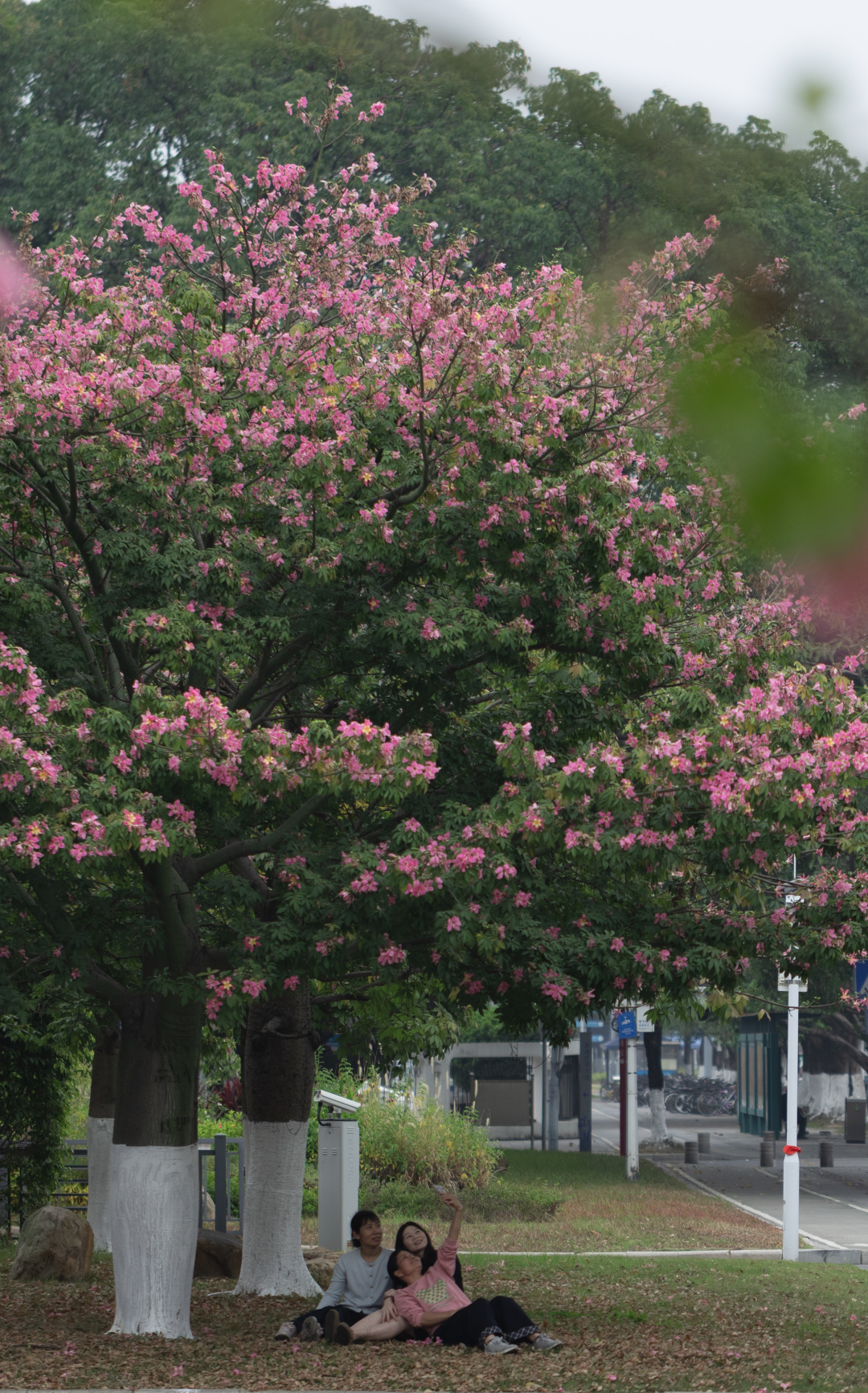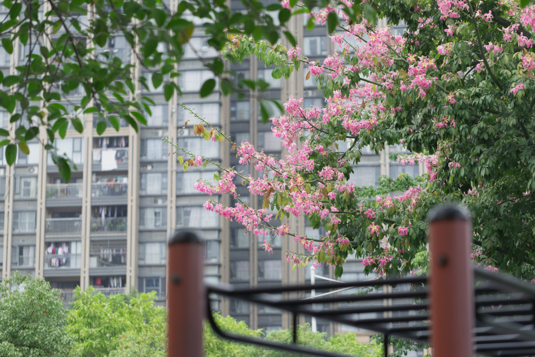 怡园小学口袋公园内的美丽异木棉,在微风中摇曳身姿,悄然绽放间引得行人拍照打卡,绘就了一幅绚丽动人的画卷。