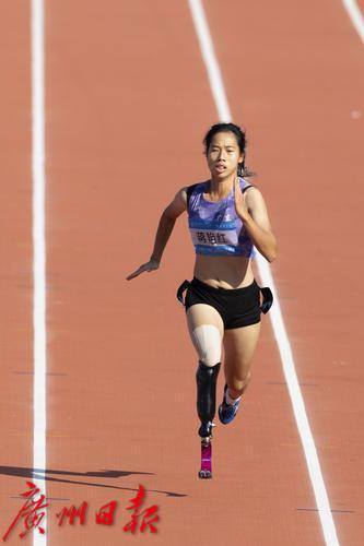 上午9时30分,田径比赛正式开始。图为广东一团运动员蒋艳红在女子100米T64级决赛中获得冠军,为广东队赢得一枚金牌。