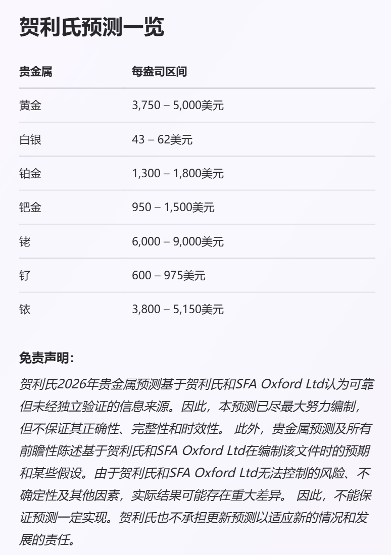12月9日,全球贵金属行业知名企业贺利氏贵金属发布预测报告认为,金、银和铂族金属价格在2026年上半年很可能呈现下行趋势。此前的涨势曾将黄金和白银推至历史高位,也令铂族金属价格创多年新高,不过涨幅过快过高。虽然价格短期内仍可能上行,但一旦动能减弱,预计贵金属价格将迎来盘整。持续的央行购金、持续的通胀以及较低的实际利率等关键因素可能支撑价格。然而,工业需求疲软和衰退风险对铂族金属构成较大的下行压力。