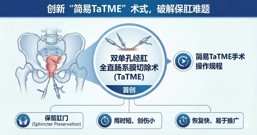 为攻克低位直肠癌保肛手术的技术瓶颈,团队创新性提出简易经肛门全直肠系膜切除术(TaTME)。该术式通过优化手术入路与步骤,在确保肿瘤根治的前提下,显著提高了低位直肠癌、肥胖、骨盆狭窄等困难病例的保肛成功率,还将此项高难技术变得安全、易于推广,从而惠及更多患者。
