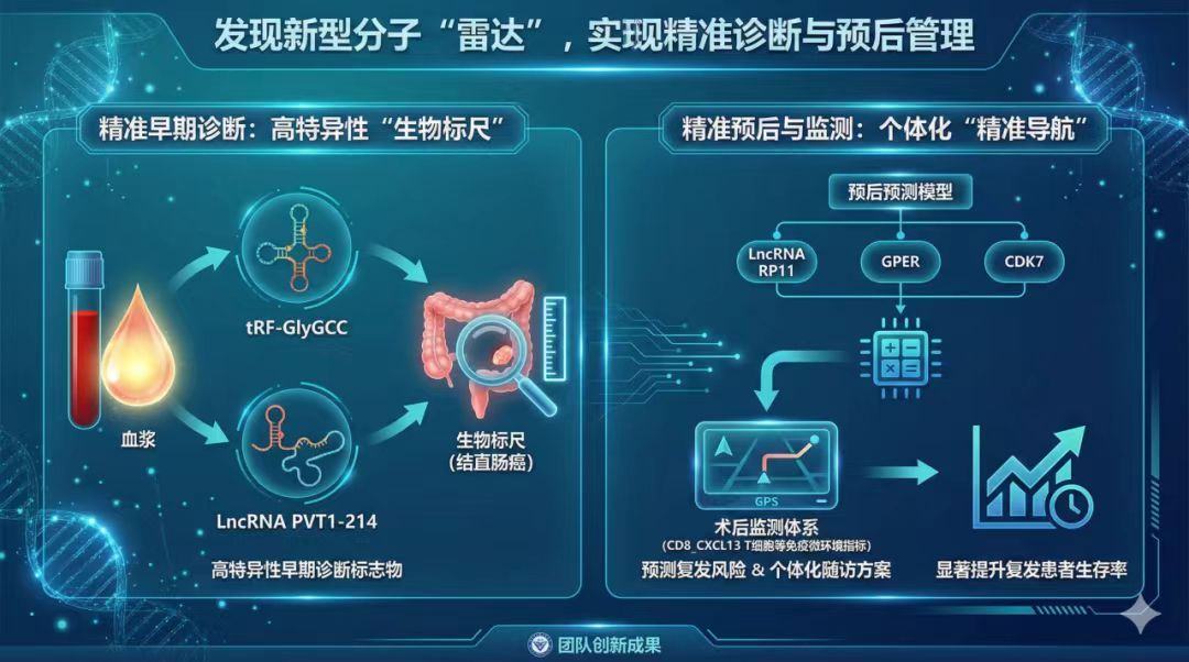 曹杰团队率先鉴定出血浆tRF-GlyGCC和LncRNA PVT1-214作为优异的早期诊断标志物,为结直肠癌早期诊断提供了高特异性“生物标尺”。同时,团队构建了涵盖多个关键分子的预后预测模型,并创新性地将CD8_CXCL13 T细胞等免疫微环境指标纳入术后监测体系,为预测复发风险和制定个体化随访方案提供了“精准导航”。