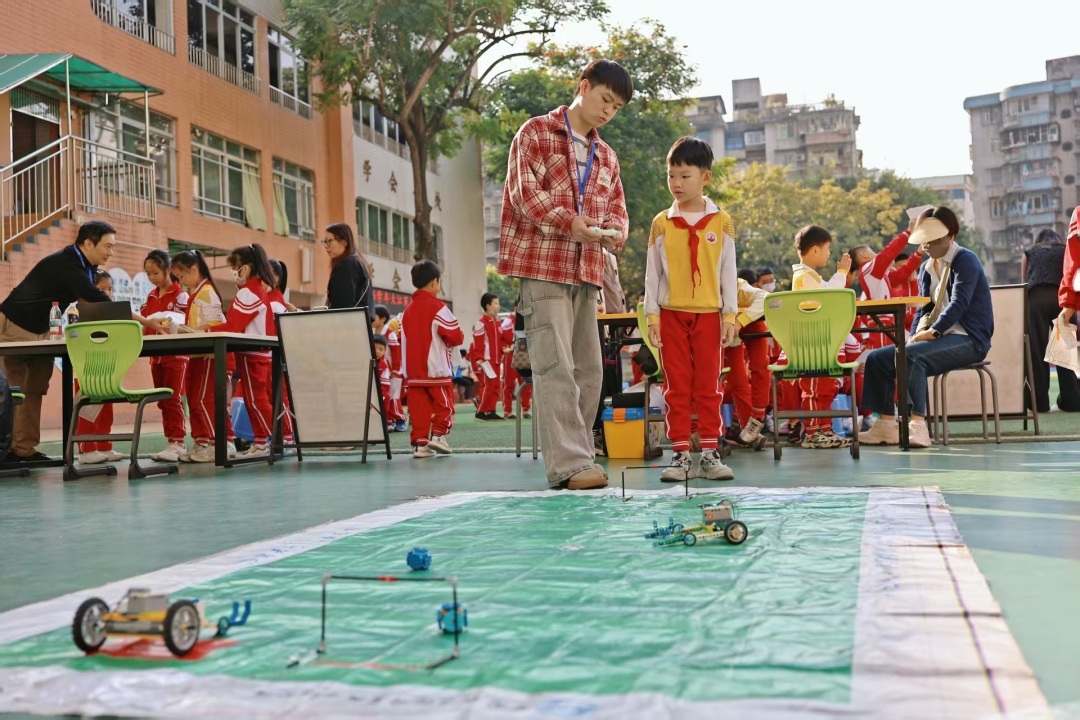 棋类擂台赛上演智慧对决,歇后语、谜语猜猜乐摊位中,同学们也笑声连连。足球机器人竞赛中,学生展现编程协作能力,AI绘图则让广府元素与科技碰撞火花。