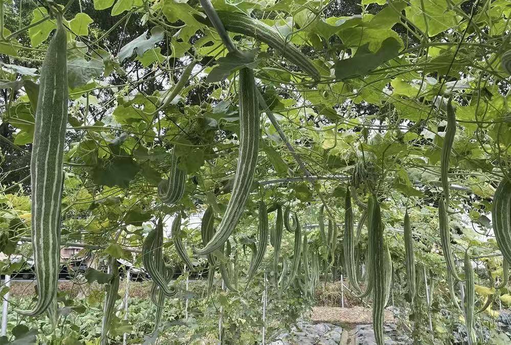 香芋南瓜、满意冬瓜、奶油南瓜……记者走访发现,这片生机勃勃的蔬果园里,种植了近百种特色蔬果,包括牛奶味的南瓜、有着苹果清香的丝瓜、形似蛇的蛇瓜等,不少是市场上罕见的品种。特别是果园中的蛇瓜,形似蜿蜒的蛇身,格外引人注目,成为采摘体验的一大亮点。