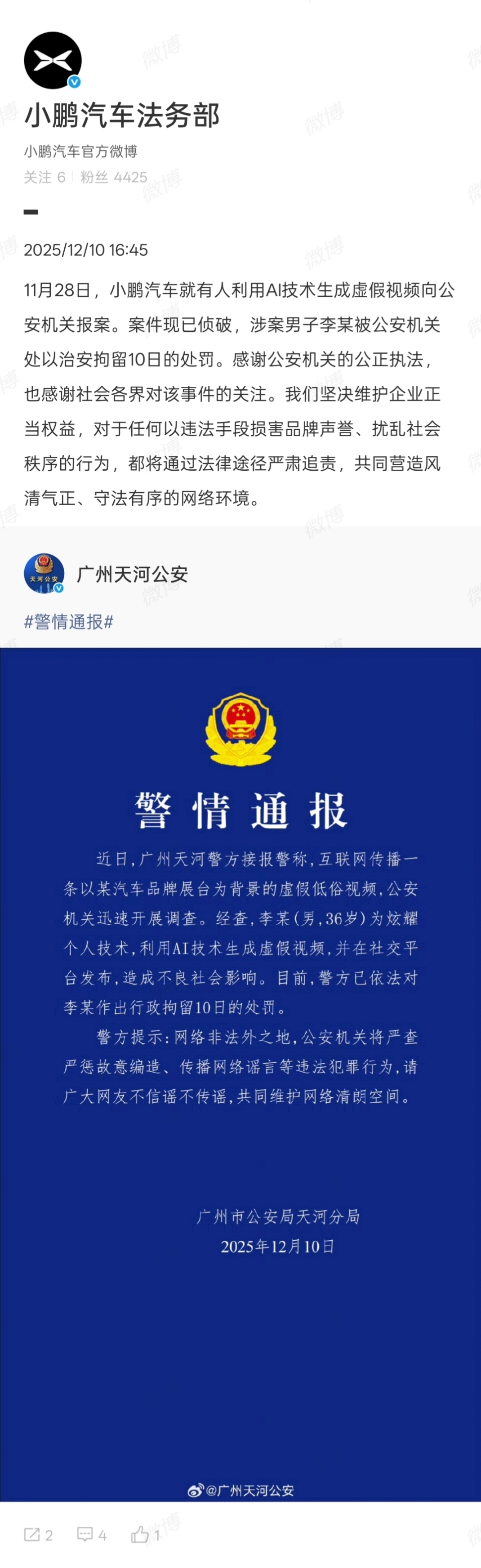 广州车展期间,小鹏汽车就有人利用AI技术生成虚假视频向公安机关报案。12月10日,小鹏汽车法务部官方微博发布声明,该案件现已侦破,涉案男子李某被公安机关处以治安拘留10日的处罚。