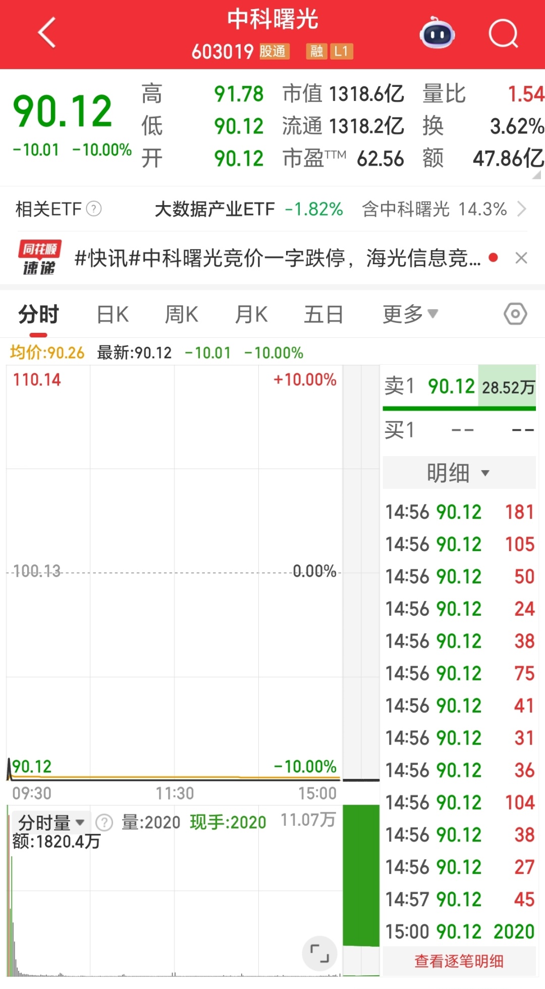 截至12月10日下午收市,海光信息微跌0.36%,中科曙光则从开市一直维持跌停,报收90.12元。