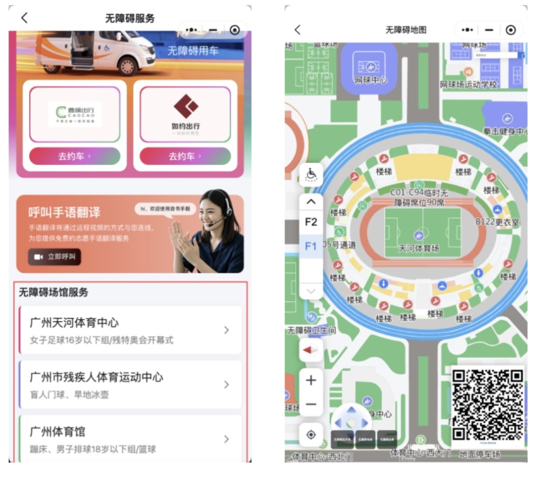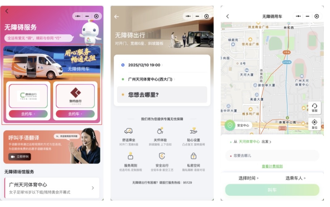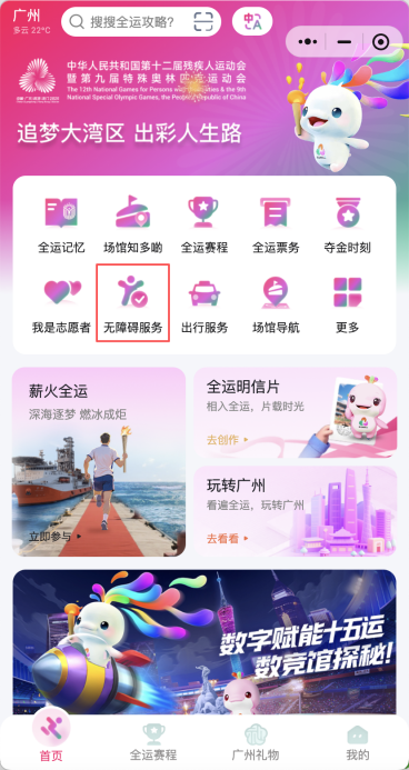 “全运广州”小程序以“科技助残”为核心,构建无障碍服务生态圈,覆盖观赛、出行、景点旅游等多个场景,让每位游客都能自在、安心地参与赛事、畅游广州。