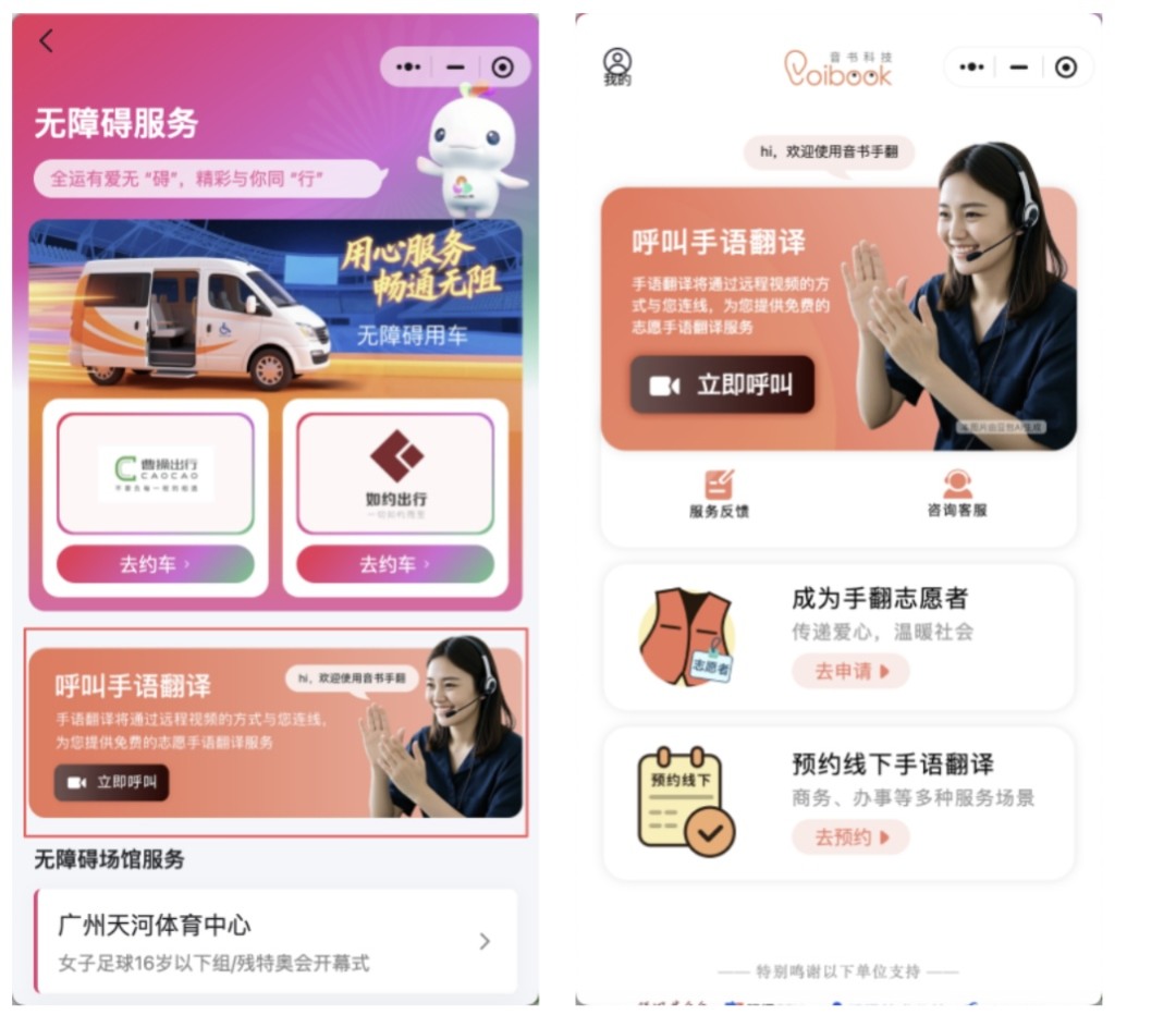针对听障人士的沟通需求,小程序接入“音书手语翻译”功能,构建“AI+真人志愿者”线上沟通翻译体系,轻点“呼叫手语翻译”,即可快速连接全国注册手语翻译志愿者,实现手语与话语双向实时转译,平台还搭载实时字幕、外语翻译等辅助功能,有力保障赛事多场景的交流顺畅。