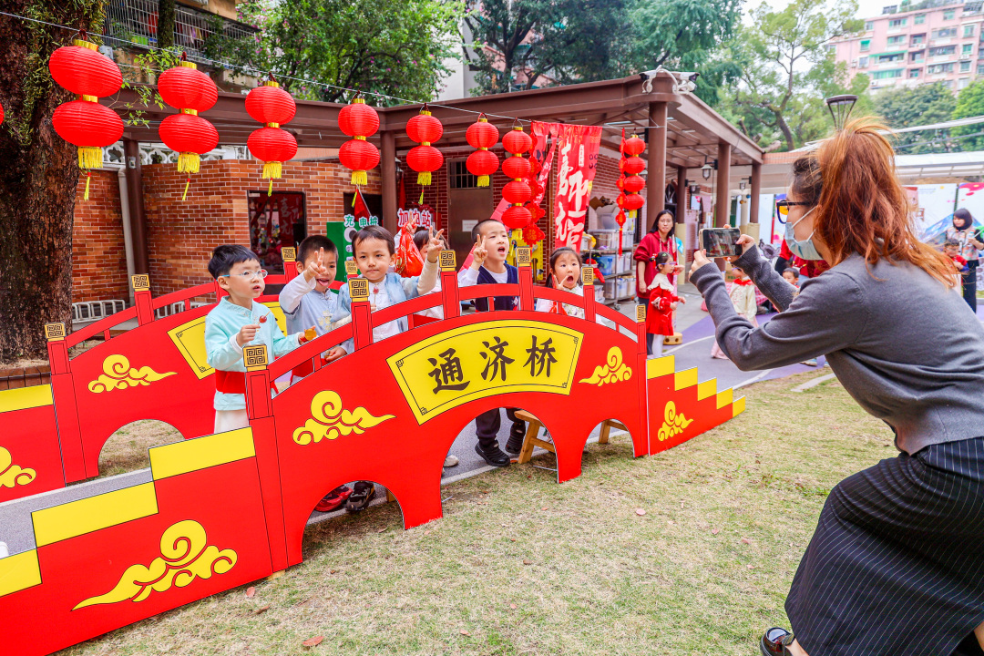 元宵节还原“行通济”百年民俗场景,迷你通济桥畔,孩子们手持生菜、风车缓步走过,高声传唱“行通济,无闭翳”的祈福谚语,搭配面塑岭南佳果、灯影风车制作、粤韵童谣传唱等活动,尽显元宵团圆纳祥的文化底蕴。