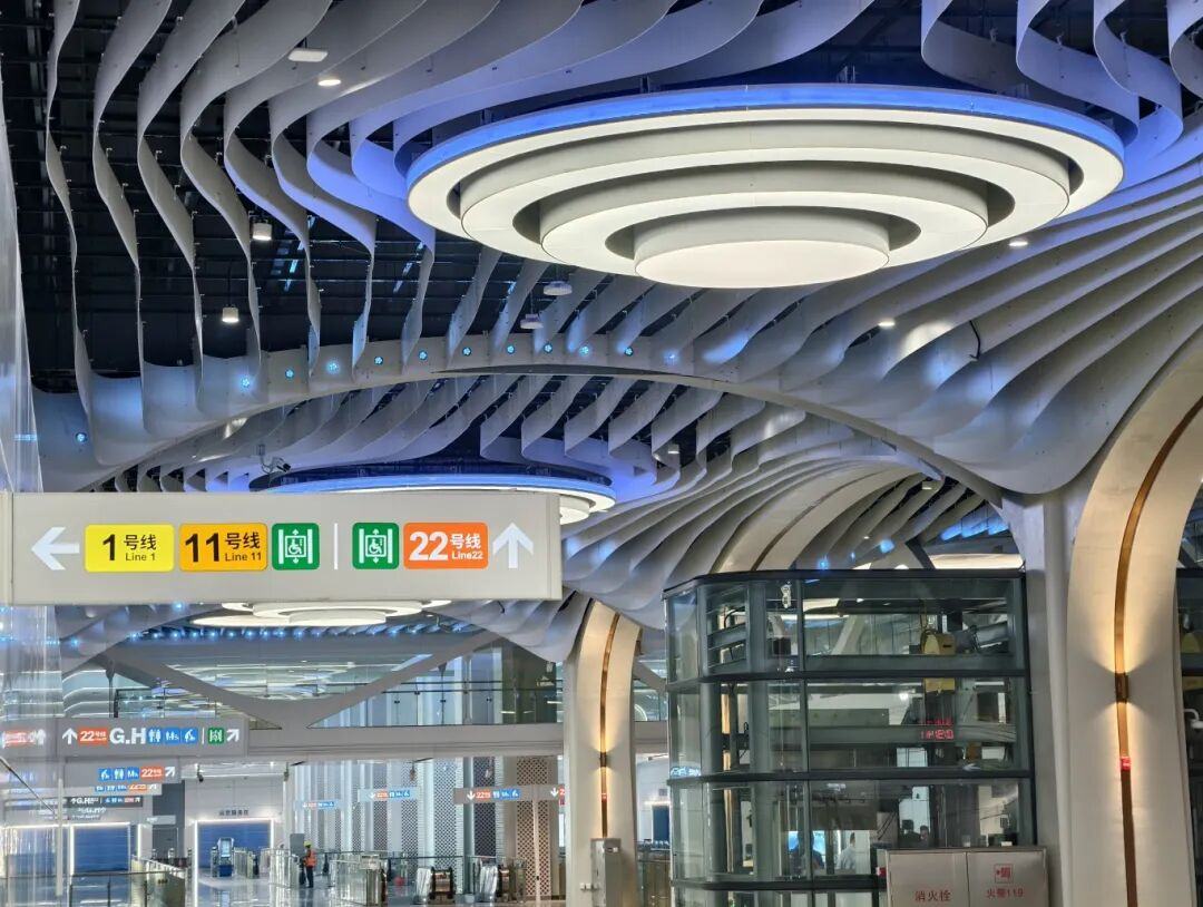 芳村站以“珠江流转、花开芳村”为设计主题,提取珠江之水以及木棉花开的设计意向。