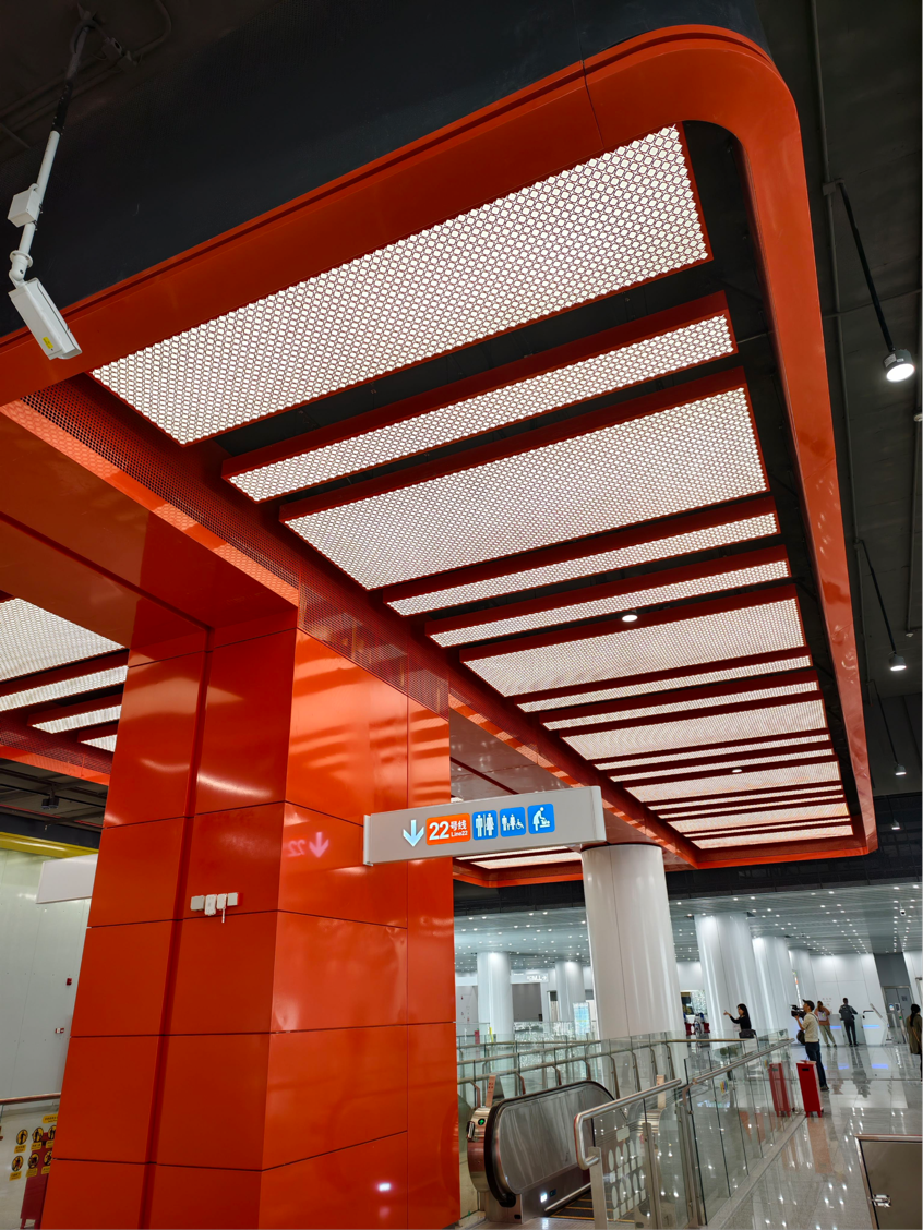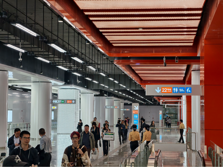 西塱站装修设计以“双城交汇广佛之窗”为主题,重空间、轻装饰、集约化管线综合设计,设色分区,通过不同线路对应的线路色,打造色彩差异化扶梯交通点,形成强烈的视觉引导系统,便于在复杂的枢纽空间中有效引导客流,提高换乘效率。