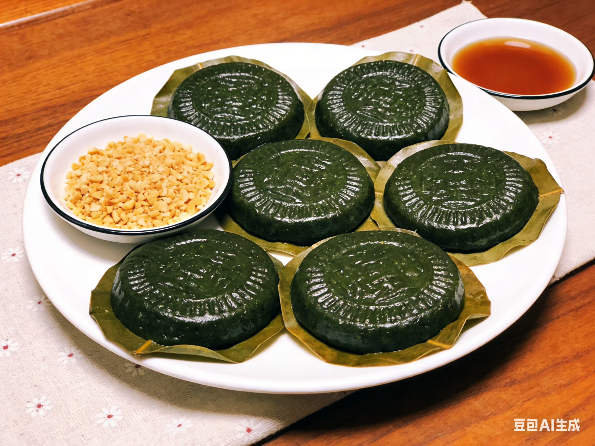 籺皮做好后,放入早已炒制好的馅料包好,馅料有甜味和咸味两种。甜味的一般是由白糖、花生、椰丝、芝麻等制作而成;咸味的则主要用绿豆、新鲜咸萝卜、虾米、肥肉丁、生葱等制作。田艾籺包好后放进雕刻精美的木印模具中,制成独特形状,然后再放进新鲜的大树菠萝叶子上,一个个垫起来。大树菠萝在粤西地区很普遍,我老家村前村后都种有大树菠萝,大树菠萝叶透气防粘,还能赋予田艾籺皮独特的香味。做籺前需将新鲜的大树菠萝叶洗净并晾干,将垫上菠萝叶的田艾籺一个个放上锅,水开后蒸8分钟左右就可以出锅,揭盖后,满屋子都弥漫着淡淡的田艾草香。