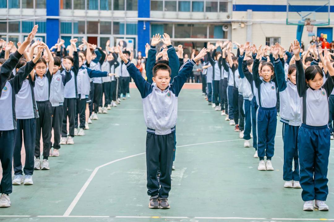随着欢快的音乐响起,阳光体育大课间展演在操场正式上演。孩子们身着整齐校服,迈着铿锵有力的步伐入场,跑操队列整齐划一,武术操一招一式刚劲有力,跳跃、拉伸等运动环节衔接自然。