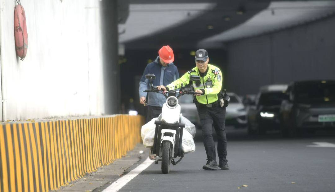 “我走隧道就是图方便,一般情况下骑小心点应该没事。”蓝衣男子告诉记者,他骑电动自行车是帮同事送午餐。“如果走珠江大桥过江,我需要骑行40多分钟,走珠江隧道不用绕行,只要15分钟。”接受处罚后,该男子提着两大包餐盒步行前往目的地。