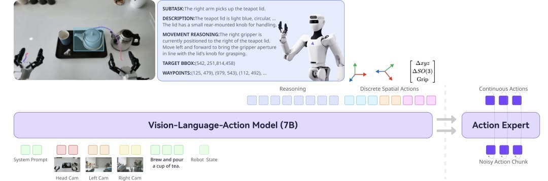 其二,结构化推理技术让机器人拥有“常识与思考能力”,模型先进行文字推理,包括抽象概念解读(如“低热量”指令对应排除可乐)、子任务拆解(如微波炉加热拆解为7步操作)、视觉观测描述、运动路径推断,再通过视觉推理实现感知与运动估计的结合,形成解释动作的结构化推理链,让“为什么做”先于“怎么做”。