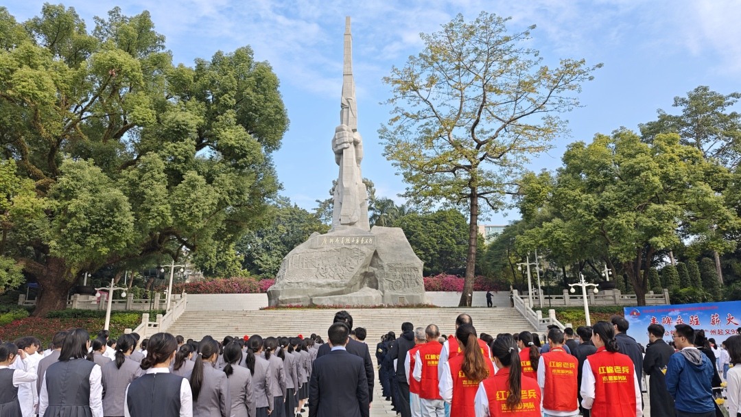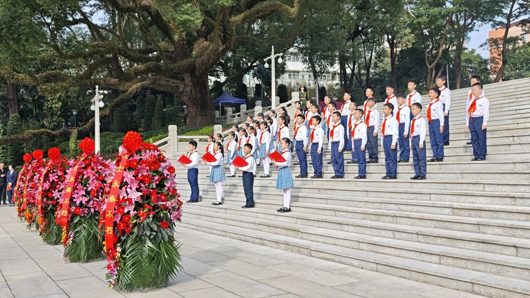 当天上午,纪念仪式在广州起义纪念碑前庄严开始。全体人员齐唱国歌后,中山三路小学40多名学生代表集体献词《英雄》,用稚嫩而坚定的声音表达对英烈的崇敬。随后,全体垂首默哀,缅怀广州起义中英勇牺牲的5700名革命烈士,悼念南京大屠杀死难者和所有惨遭日本侵略者杀戮的死难同胞。