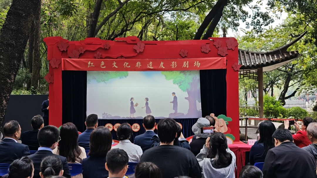纪念仪式后,参与人员在陵园讲解员的指引下参观“刑场上的婚礼”纪念广场,并在“信仰之光”剧场观看非遗红色皮影戏《信仰之光——刑场上的婚礼》《半条被子》。据介绍,《信仰之光——刑场上的婚礼》创新引入非遗元素,以皮影戏形式生动再现周文雍、陈铁军“红棉并蒂”的革命爱情传奇。《半条被子》讲述1934年红军长征途中借宿群众家中,三位女红军临行前把仅有的一床被子剪下一半留给群众的感人故事。