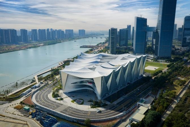 “金属海浪”流畅涌动,钢结构立面如同巨轮上高悬的风帆,勾勒湾区天际线……记者在现场看到,新地标气势万千,如同联通中国与世界的科技方舟。屋面“金属海浪”由26片凹形曲面拼接而成。屋面长170米,宽150米,最大高差达21米。