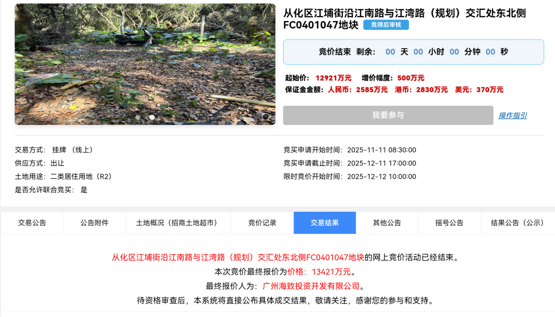 在广州12月12日土拍中,从化区江埔街沿江南路与江湾路(规划)交汇处东北侧FC0401047地块成功出让,竞得者为中建国际,折合楼面地价约为5257元/平方米。据悉,该地块位于地铁14号线从化站附近,直线距离约800米。根据出让公告,地块宗地面积约17388.94平方米,建筑面积约25531.96平方米。以12921万元的挂牌起始价计算,起拍楼面价约5061元/平方米。地块容积率为2.0,建筑限高60米,这也意味着项目未来大概率将建设为小高层住宅产品。