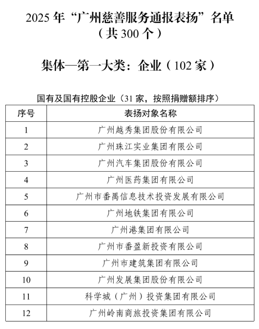 值得关注的是,首届广州慈善服务表扬对象涵盖企业、社会组织、其他组织和个人四大类别,共计300个集体和个人。企业类别中,102家企业获得表扬,涵盖国有及国有控股企业31家、民营企业46家、港澳台及外资企业13家、律师事务所7家、集体所有制企业5家。从广州越秀集团、广汽集团等国企,到长隆集团、立白集团等民营企业,再到新世界中国、安利(中国)等外资企业,不同所有制、不同规模的企业共同彰显了广州这座慈善之城不可或缺的企业社会责任担当。