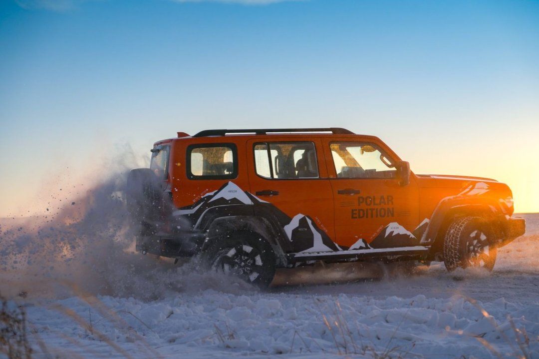 为强化极地属性,新车还融入大量用户投票选出的专属设计:“极地橙”车色活力四射,“极地荣耀”徽章与“极地锋芒”拉花彰显独特身份;可远控前风挡加热、雨刮喷嘴加热、AT全地形轮胎、电子遥控绞盘等极境配置一应俱全,让车辆在恶劣环境下依旧表现稳定。