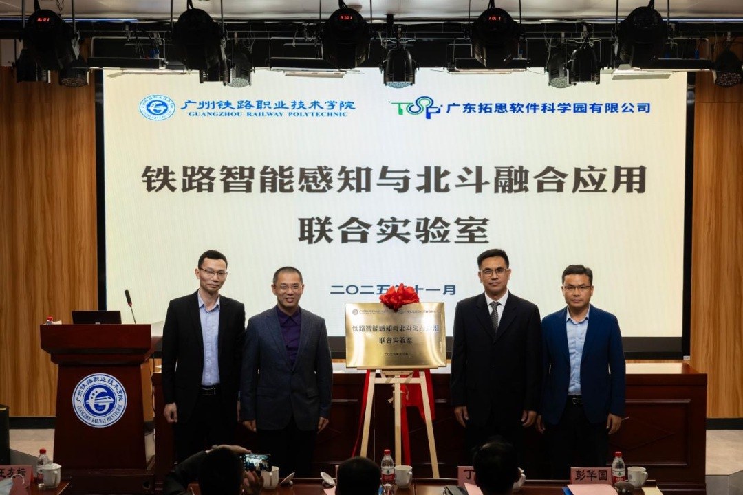 活动现场,“铁路智能感知与北斗融合应用联合实验室”正式揭牌。活动上还举行了“广州轨道交通国际科创中心”授牌仪式。广州铁职院与5家企业现场签约,标志着该校在智能轨道交通关键技术研发与国际创新合作方面迈出重要步伐。