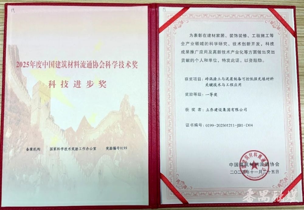12月10日,由中国建筑材料流通协会主办的“2025行业之光大会——第34届全国建材与家居行业年会暨协会七届四次理事会扩大会议”在佛山举行。会上正式揭晓并颁发2025年度中国建筑材料流通协会科学技术奖。番禺企业立乔建设集团有限公司参与完成的科研项目“砖混渣土与泥浆制备可控低强充填材料关键技术与工程应用”荣获2025年度中国建筑材料流通协会科学技术奖科技进步奖一等奖。