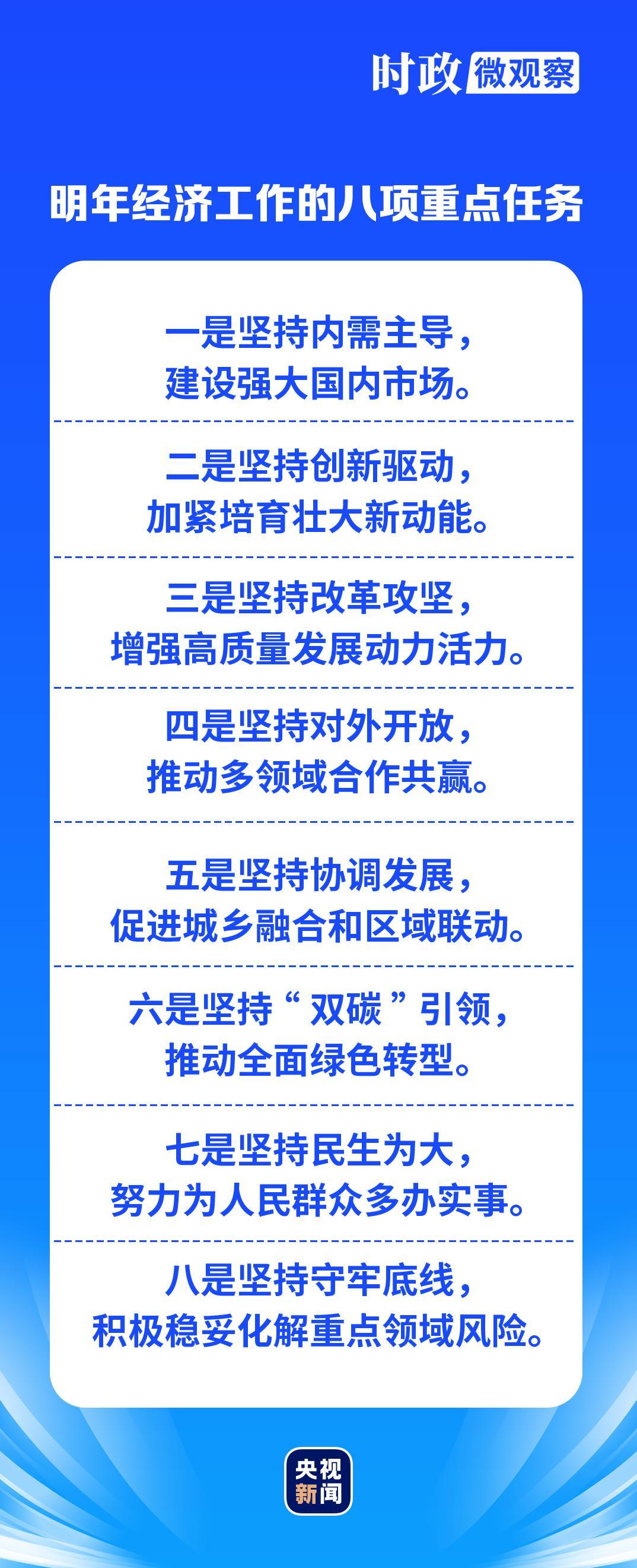 此次中央经济工作会议确定的明年经济工作重点任务,包括“坚持改革攻坚,增强高质量发展动力活力”“坚持对外开放,推动多领域合作共赢”等。