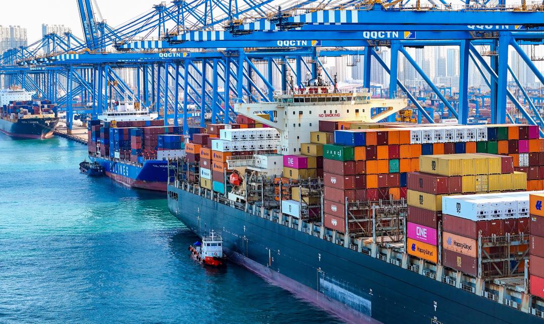 △货轮在山东港口青岛港全自动化码头装卸货物。